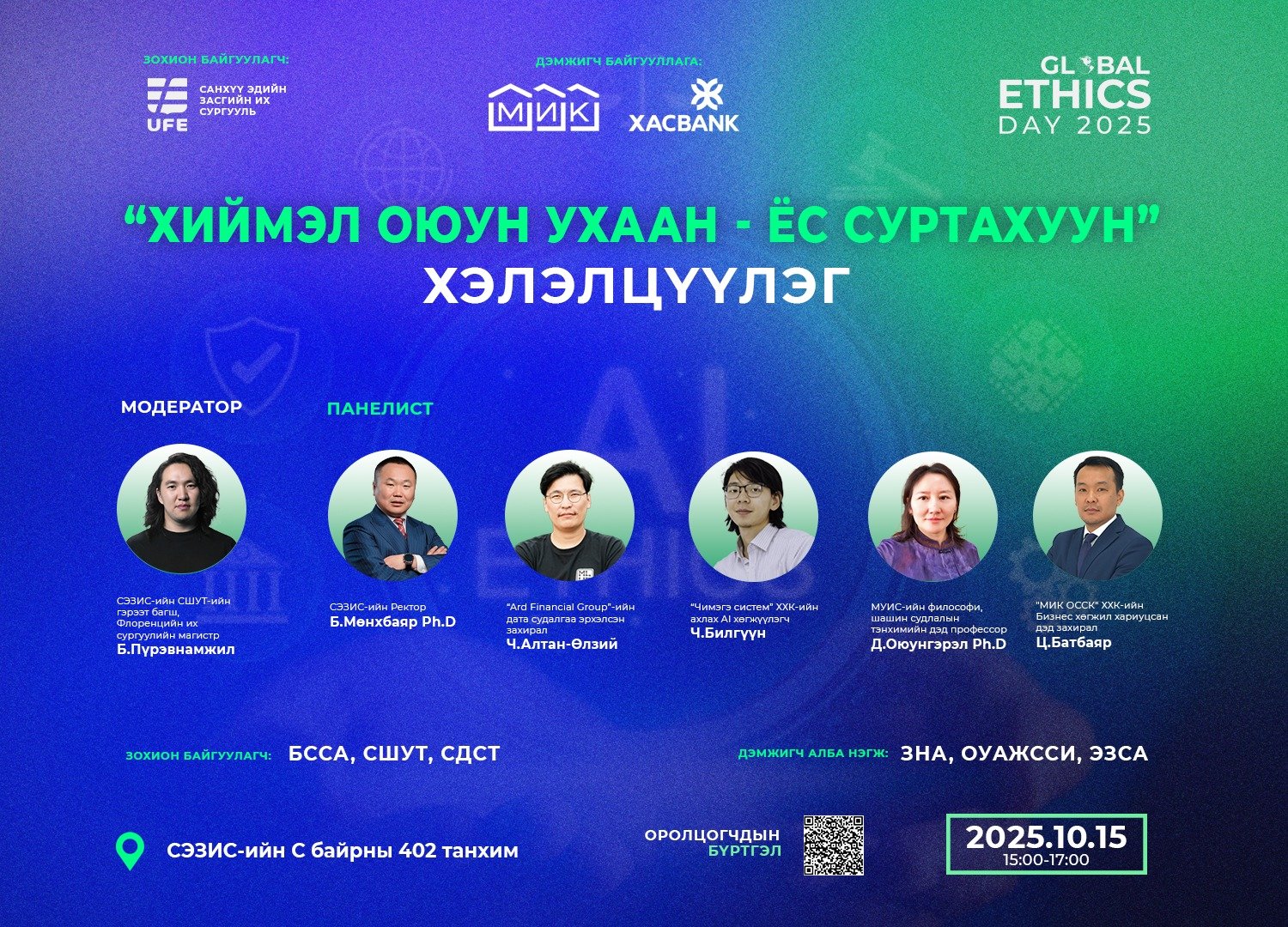 Жил бүрийн аравдугаар сарын гурав дахь долоо хоногт дэлхий нийтээрээ “Дэлхийн ёс зүйн өдөр” (Global Ethics Day)-ийг тэмдэглэдэг уламжлалтай. “Дэлхийн ёс зүйн өдөр”-ийг тохиолдуулан “Хиймэл оюун ухаан ба ёс суртахуун” сэдвээр аравдугаар сарын 15-нд СЭЗИС-д панел хэлэлцүүлгийг олон нийтэд нээлттэй байдлаар зохион байгуулахаар төлөвлөжээ.