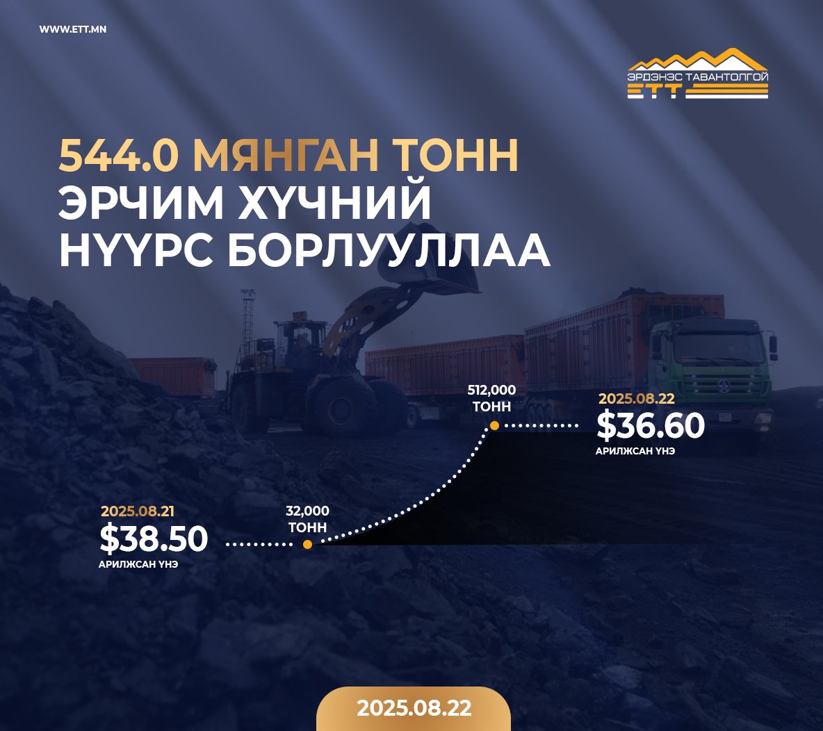 "Эрдэнэс Тавантолгой" ХК 2025 оны наймдугаар сарын 21-ний өдөр Монголын хөрөнгийн биржээр дамжуулан 5 багц буюу 32 мянган тонн эрчим хүчний нүүрс 38.5 ам.доллароор, наймдугаар сарын 22-ны өдөр 80 багц буюу 512 мянган тонн эрчим хүчний нүүрс 36.6 ам.доллароор, БНХАУ-ын Ганцмод боомт хүргэж өгөх нөхцөлөөр тус тус амжилттай арилжлаа.