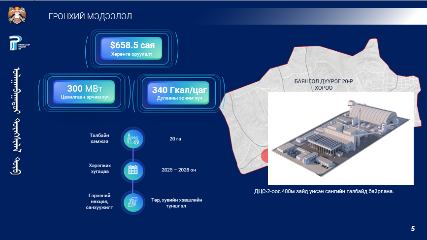 Баянгол дүүргийн 20-р хорооны нутаг дэвсгэр Дулааны II цахилгаан станцаас 400 метрийн зайд үндсэн сангийн талбайд баригдах уг Дулааны V цахилгаан станц нь 300 МВт цахилгаан эрчим хүч, 340Гкал/цаг дулааны эрчим хүч үйлдвэрлэх хүчин чадалтай юм. Түүнчлэн CFB зуух, агаарын хөргөлттэй, олон шатлалт агаар бохирдлын хяналттай байгальд ээлтэй технологийг ашиглах байна. Тус төслийг Монгол Улсын эрчим хүчний аюулгүй байдлыг хангах, эдийн засгийн үр ашигтай, байгаль орчинд ээлтэй, төр, хувийн хэвшлийн хамтын ажиллагааны жишиг төсөл болон хэрэгжих бүрэн үндэслэлтэй гэж үзэн Төр, хувийн хэвшлийн түншлэлийн тухай хуулийн 15.1.1-т заасан “Зураг төсөл, төсвийг боловсруулах, барих, ашиглах, шилжүүлэх” хэлбэрээр буюу олон улсын практикт түгээмэл хэрэглэгддэг DBFOM (Design, Build, Finance, Operate, Maintain) хэлбэрээр нэг түншлэлийн гэрээгээр хэрэгжүүлэх нь зүйтэй гэж үзэж байгаа юм.
