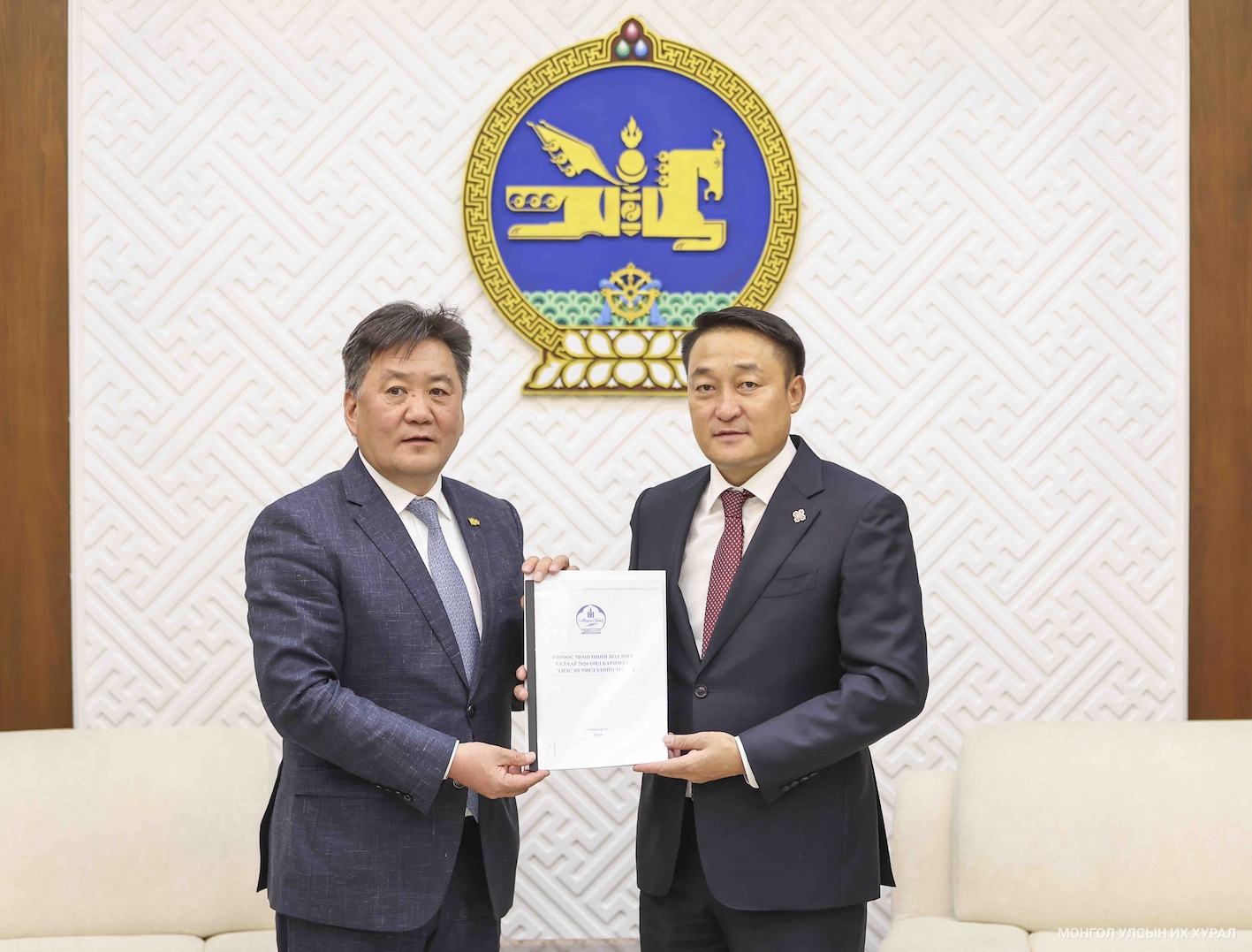 Монголбанкны Ерөнхийлөгч Б.Лхагвасүрэн УИХ-ын дарга Д.Амарбаясгаланд Төрөөс Мөнгөний бодлогын талаар 2026 онд баримтлах үндсэн чиглэлийн төслийг өнөөдөр /2025.09.30/ өргөн барилаа.